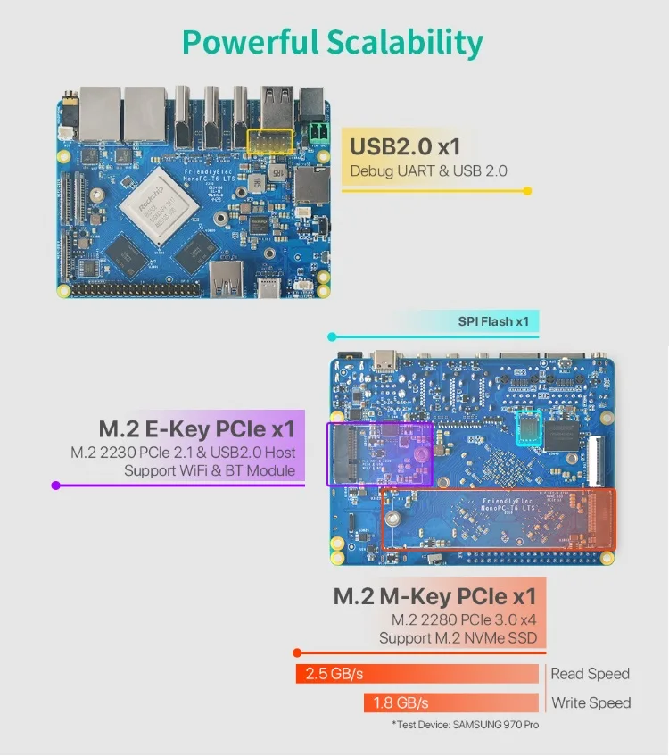 1 x Mi cro SD Slot: support up to SDR104 mode PCle 3.0: 1 x M.2 M-Key, PCle 3.0 x4 for NVMe SSDs up to 2,500 MB/s Onboard M3 PCB nut for mounting M.2 2280 module |