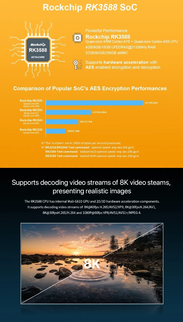 compatible with H D M I2.1, H D M I2.0, and H D M I1.4 operation one support displays up to 7680x4320@60Hz, another one support up to 4Kp60 Support RGB/YUV(up to 10bit) format 2 x 4-lane MIPI-DSI, compatible with MIPI DPHY 2.0 or CPHY 1.1 |
